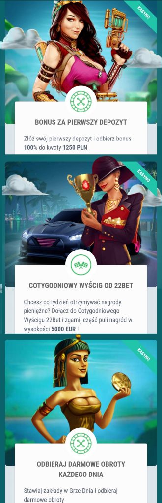 Na dzień dzisiejszy Bonusy w kasynie 22bet przedstawiają się tak: