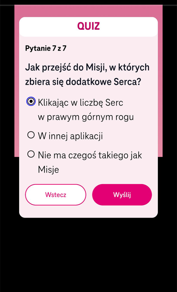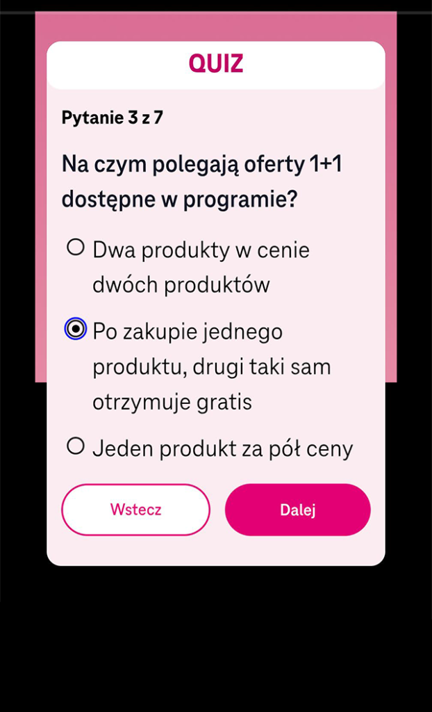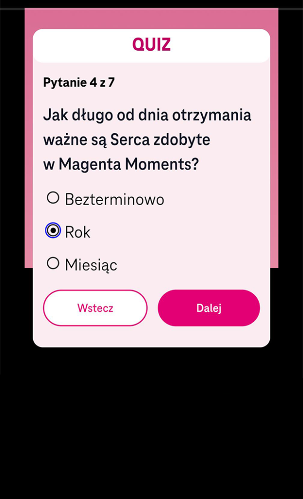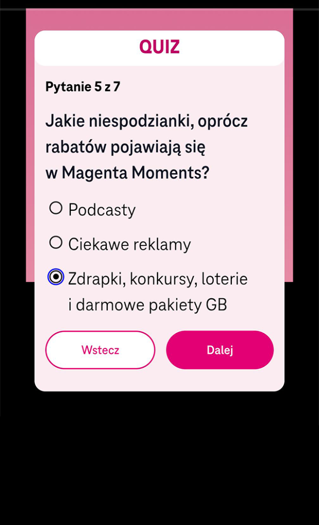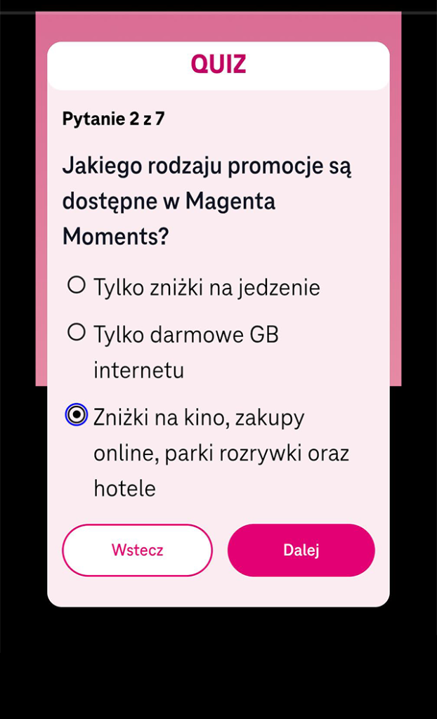 W aplikacji Magenta Moments quiz pojawia się w formie siedmiu pytań wielokrotnego wyboru. Za każde poprawne rozwiązanie użytkownik otrzymuje serca Magenta, które można potem wymieniać na rabaty, promocje lub inne niespodzianki.