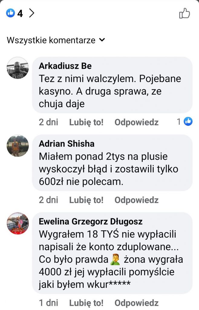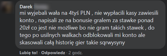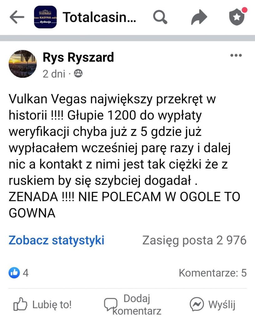Do napisania tego artykułu skłonił mnie kolejny niepochlebny wpis o Vulkan na największej polskiej grupie dyskusyjnej o kasynach na Facebook’u. Następny gracz został oszukany przez Vulkan Vegas i zamieścił taki post:
