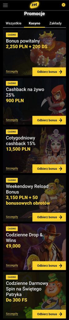 Poniżej przedstawiam BONUSY dostępne „na dzisiaj” w Zet Casino. Nie będę opisywał każdego bonusu z osobna, proszę wejść w sekcję na interesującym nas Bonusie. Jak widać mamy sowity BONUS od pierwszej wpłaty tj. 100% więcej do kwoty 2250 PLN + 200 Darmowych Spinów. Jest również weekendowy Bonus za kolejną wpłatę oraz tzw. Cashback czyli zwrot przegranej kasy.