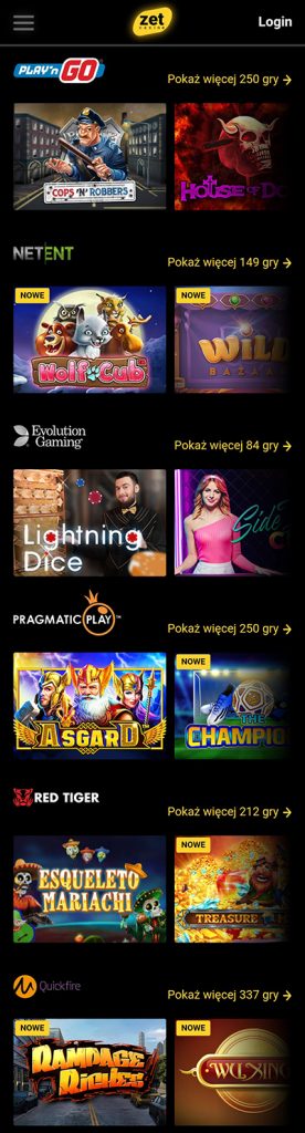 Zet Casino ma wszystkich liczących się producentów gier a co za tym idzie gier do wyboru są tysiące. Na zrzucie ekranu widać tylko mały wycinek tego co mają w ofercie. Zwróć uwagę na liczbę gier przy każdym producencie.