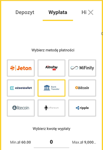 Minimalna kwota wypłaty to 60 PLN, zależy od metody.